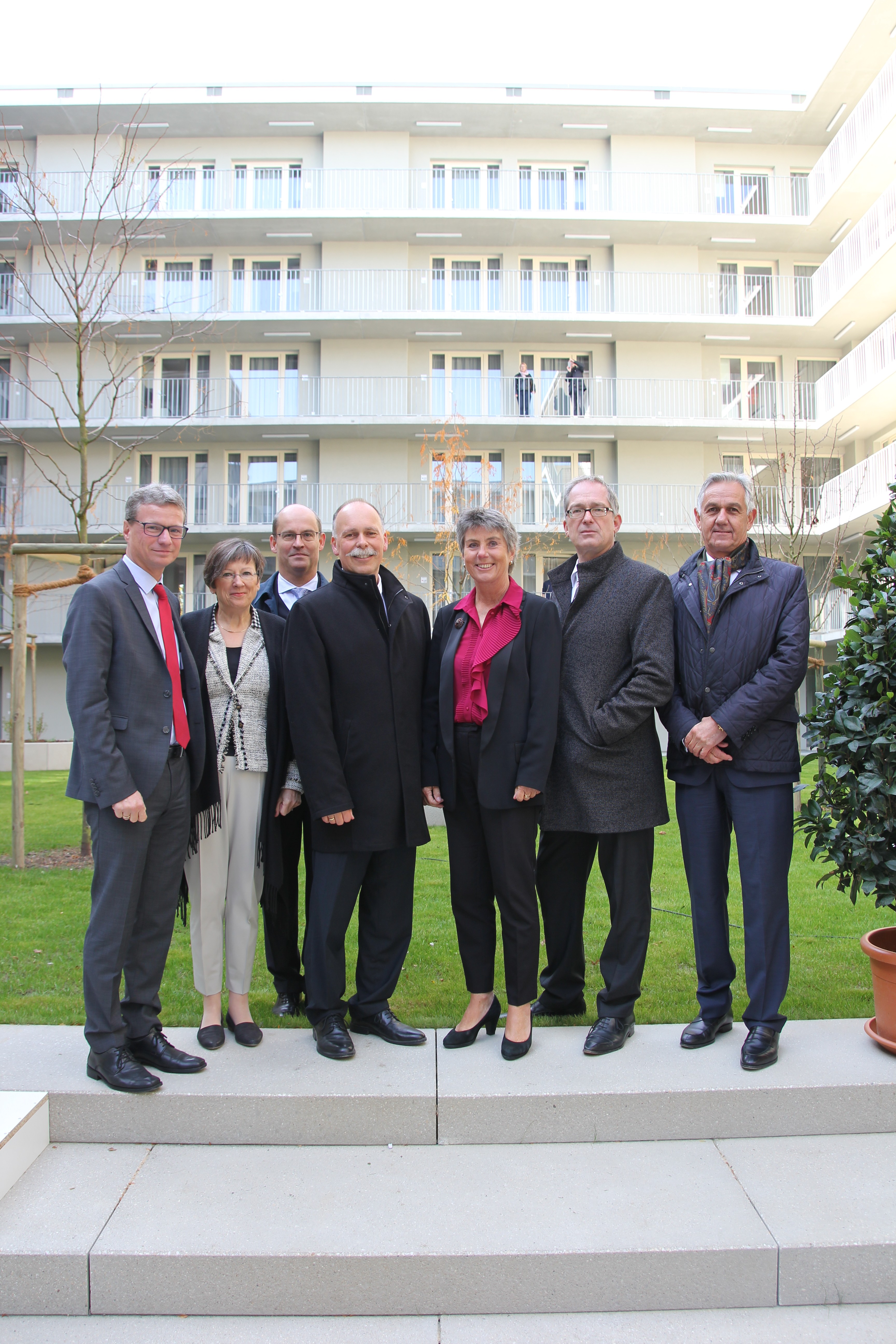 (v. l. n. r.) Staatssekretär Bernd Sibler, die Präsidentin der Regierung von Oberfranken, Heidrun Piwernetz, Dr. Markus Zanner, Kanzler der Universität Bayreuth, Josef Tost, Geschäftsführer des Studentenwerks Oberfranken, die Bayreuther Oberbürgermeisterin Brigitte Merk-Erbe, der Präsident der Universität Bayreuth, Prof. Dr. Stefan Leibe, und Peter Klappan, Geschäftsführer der KLAPPAN Gruppe.